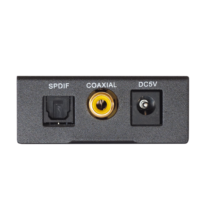 Digital / Analog Audio Converter im schwarzen Metallgehäuse. Genügt auch professionellen Ansprüchen, wandelt digitale Coaxial oder Toslink Stereo-Audiosignale (z.B. TV) in ein analoges L/R Audiosignal um und lässt sich mit einem externen Gerät (z.B. Verstärker), via Stereo RCA-Kabel, verbinden. Auffallend klein und besonders einfach zu installieren. Mit 3.5 mm Kopfhörerbuchse und LED Betriebsanzeige. Abtastrate: 32, 44.1, 48, 96 kHz und 192 kHz, 24 Bit. Lieferung inklusive 5V / 1A Netzteil.